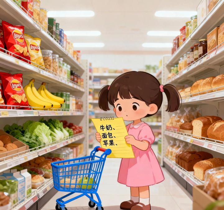 我每周都会带孩子们去超市,给他们一张购物清单,让他们自己去采购。